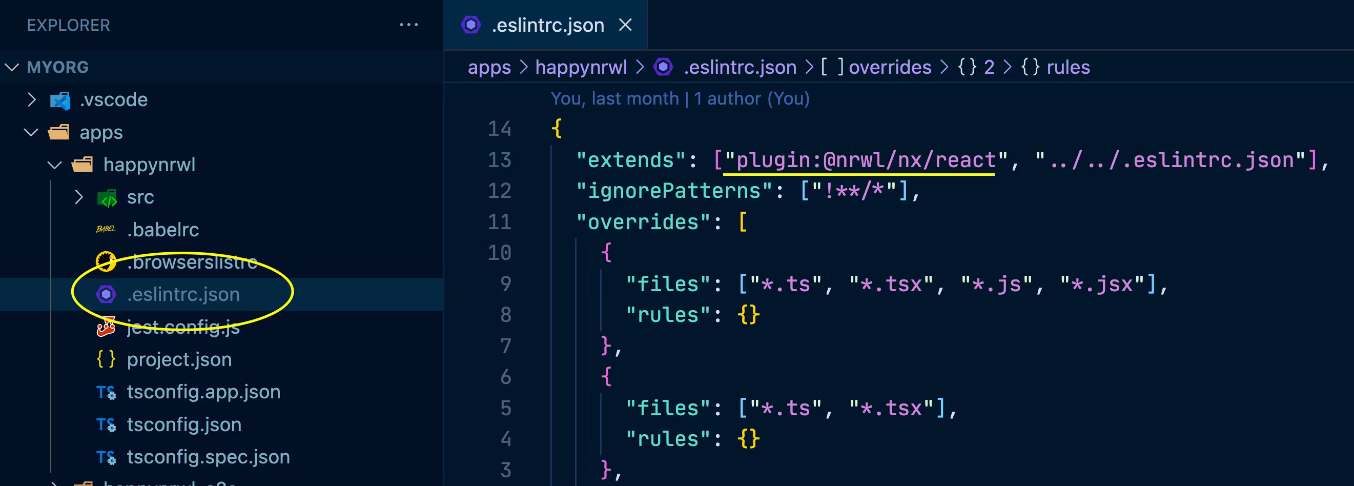 Every project generated by Nx comes with a .eslintrc.json file. That configuration extends from an ESLint plugin @nrwl/nx/react , containing a set of best practices rules, and at the same time allows you to add further rules that are specific to your needs.